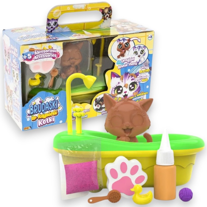 Poznaj kolekcję przesłodkich kotków, które można brudzić błotkiem, myć i zaczynać całą zabawę od nowa! Brudaski w kąpieli kotki to urocze figurki, które zostały stworzone po to, by zapewnić dzieciom mnóstwo radości i niezliczone możliwości kreatywnej zabawy. Dzięki specjalnej powłoce łatwo je wyczyścić, a zabawę ulepszą dołączone do kotków akcesoria.