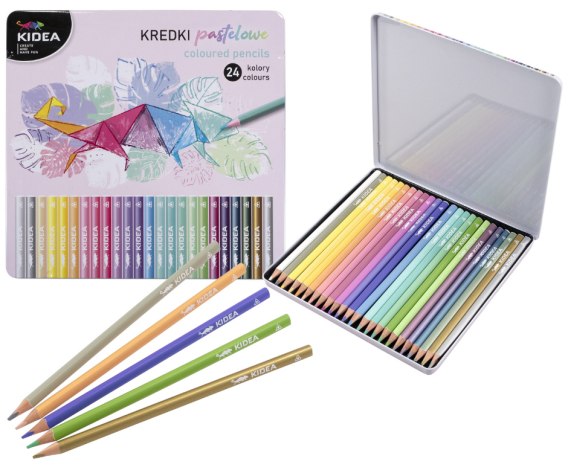 Kredki PASTELOWE trójkątne w metalowym pudełku 24 kolorów KIDEA KPTMP24KA