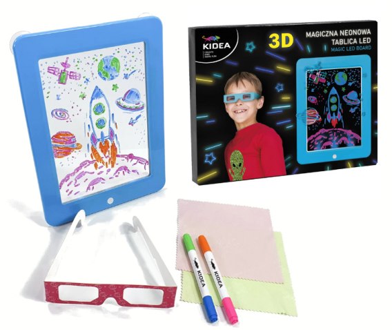 Magiczna neonowa tablica 3D w niebieskim kolorze idealnie sprawdzi się podczas nauki rysowania oraz pisania.