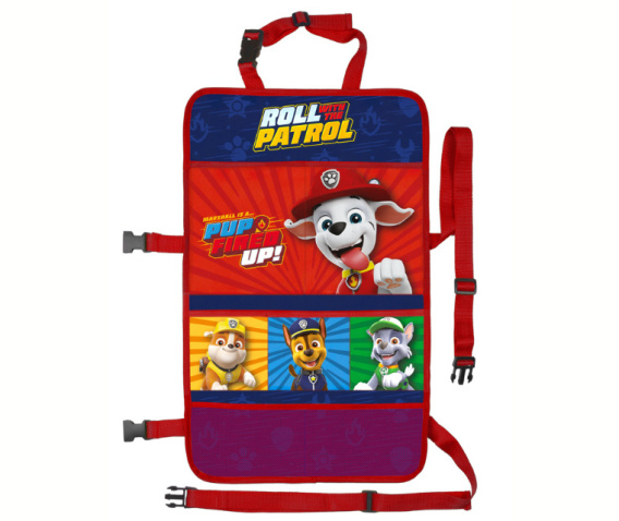 Uniwersalny organizer ozdobiony motywami z popularnej bajki Psi Patrol, pasuje do większości foteli samochodowych.