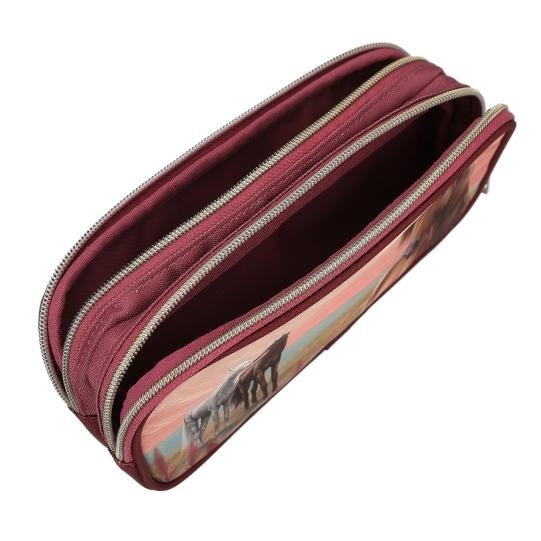 Czysty jeździecki sen: Przód tego jagodowego piórnika od Miss Melody zdobi oniryczny motyw trzech koni na tle pięknego wieczornego nieba.
