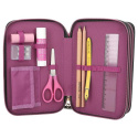 Trzy oddzielne przegrody piórnika są w całości wypełnione 18 kolorowankami i pisakami, 2 ołówkami, temperówką, gumką, linijką, nożyczkami, klejem w sztyfcie i małą kieszonką na rzep.