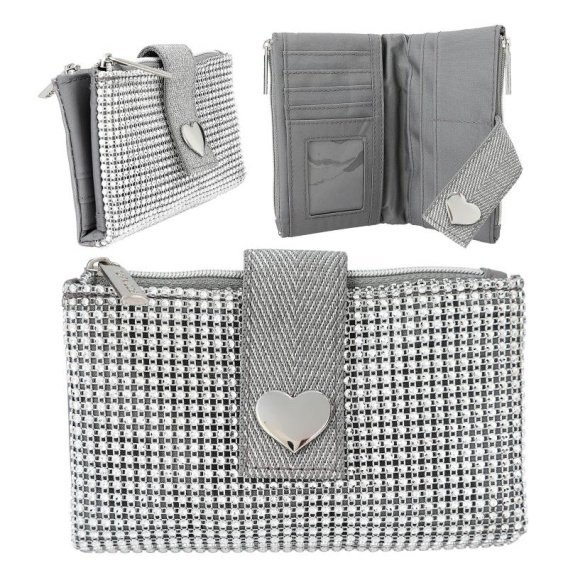 Stylowy portfel TOP MODEL wykonany jest dookoła ze srebrnej brokatowej siateczki i posiada klapę zapinaną na guzik w kształcie serca ozdobioną połyskującym lureksem.