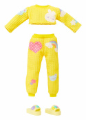 Rainbow High Jr High PJ Party Sunny ubrana jest w uroczy dwuczęściowy, żółty komplet piżamowy i dopasowane żółte kapcie.