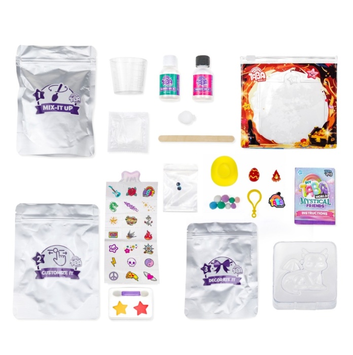 PL: UWAGA! OSTRZEŻENIE! Ryzyko zadławienia – małe elementy. Nieodpowiednie dla dzieci poniżej 3 roku życia. Zalecany jest nadzór osoby dorosłej. Nie spożywaj żadnych elementów z tego zestawu. Nie dotykaj oczu, nosa ani ust podczas pracy z zestawem. Nie wylewaj zawartości zestawu do kanalizacji. Sugerowany wiek 8+. Przed użyciem odpakuj produkt. Opakowanie nie jest zabawką i nie powinno być pozostawione bez opieki z dziećmi – należy je zachować, ponieważ zawiera ważne informacje. Produkt może różnić się kolorem oraz wzorem od przedstawionego na opakowaniu. Zestaw zawiera: Klej Taba część A, klej Taba część B, forma, kubek do mieszania, pojemnik na farbę, patyczek do mieszania, pompony, zawieszka TABA, dzwonek, brelok, klips, rękawiczki, zapach, arkusz tatuażu, 2 zawieszki żywiczne, 2 kolorowe proszki Taba, aplikator, 2 oczy, akcesoria i instrukcje. Wyprodukowano w Chinach.