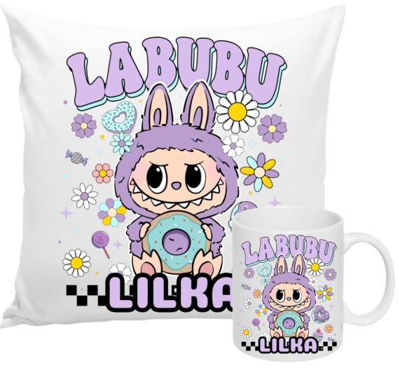 ZESTAW KUBEK I PODUSZKA LABUBU FIOLETOWY + IMIĘ PREZENT URODZINY