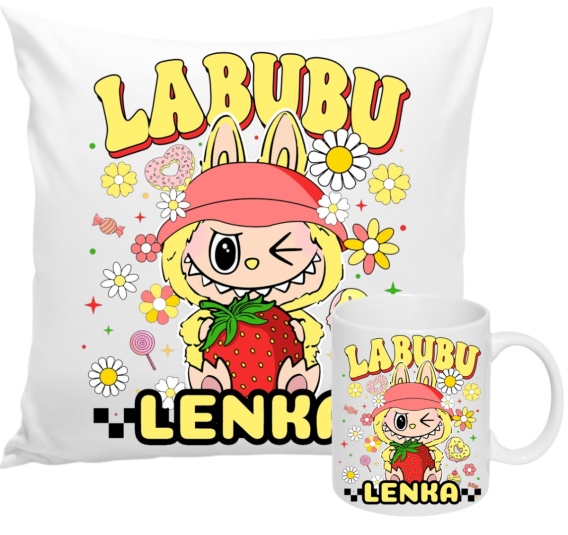 ZESTAW KUBEK I PODUSZKA LABUBU ŻÓŁTY + IMIĘ PREZENT URODZINY